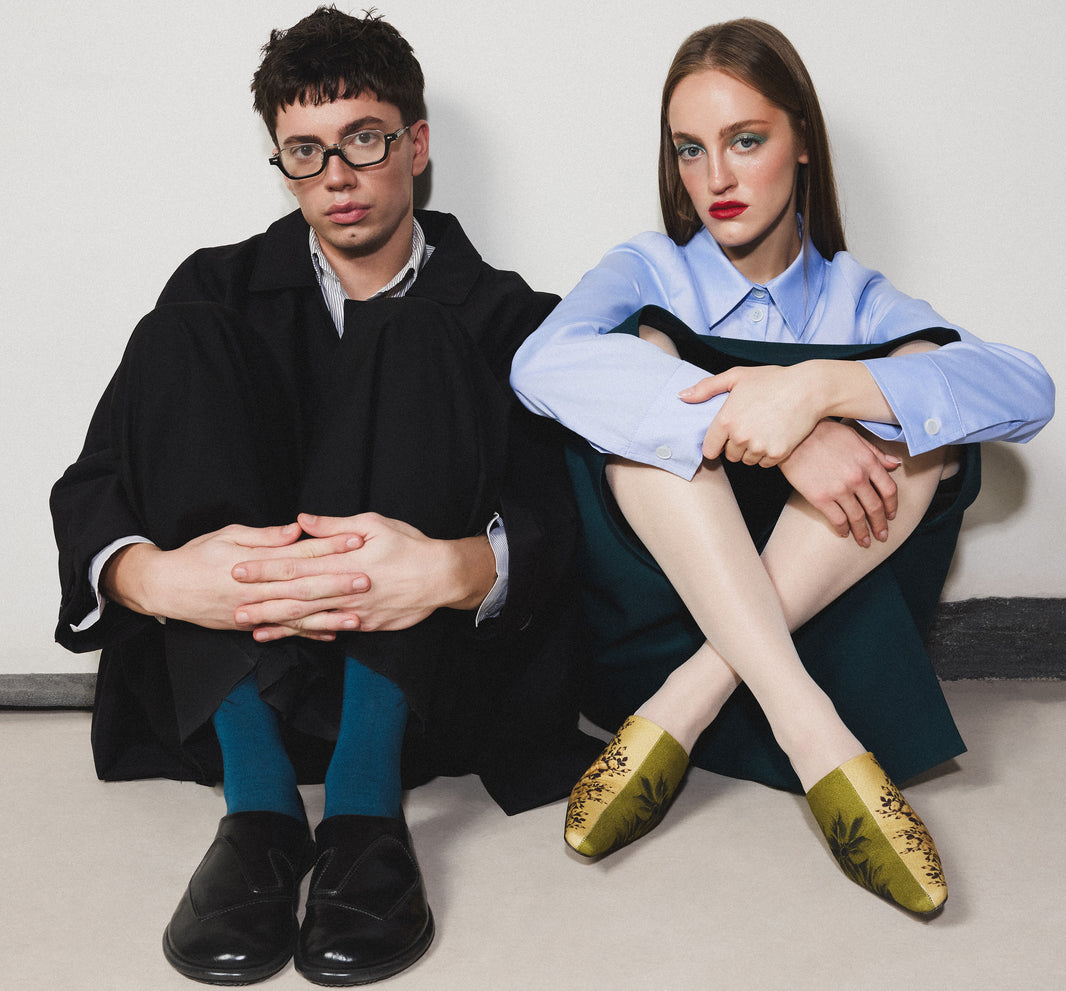 The escapism aesthetic draws inspiration from floral patterns produced in an umbrella factory in Germany in the late 1960s. These patterns are brought back to life in bags and boots, blending the naivety of the past with the reality of today.